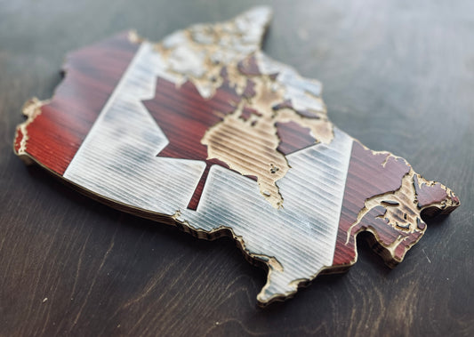 Wooden Canada Map Flag (Detailed) | Pine | Red & White & Natural | Canada Shape Flag